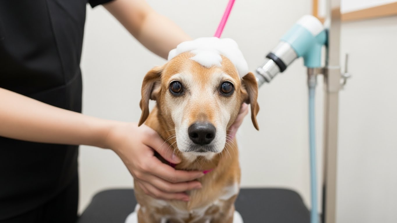 具体的には、アルコールや強い香料を抑えた犬用シャンプーで、保湿成分(アミノ酸系、ヒアルロン酸、セラミドなど)が配合されているタイプがよく使われます。皮膚トラブルを起こしやすい子には、獣医師と相談のうえで薬用シャンプーを使うケースもありますが、その場合も使用頻度や希釈方法に注意が必要です。