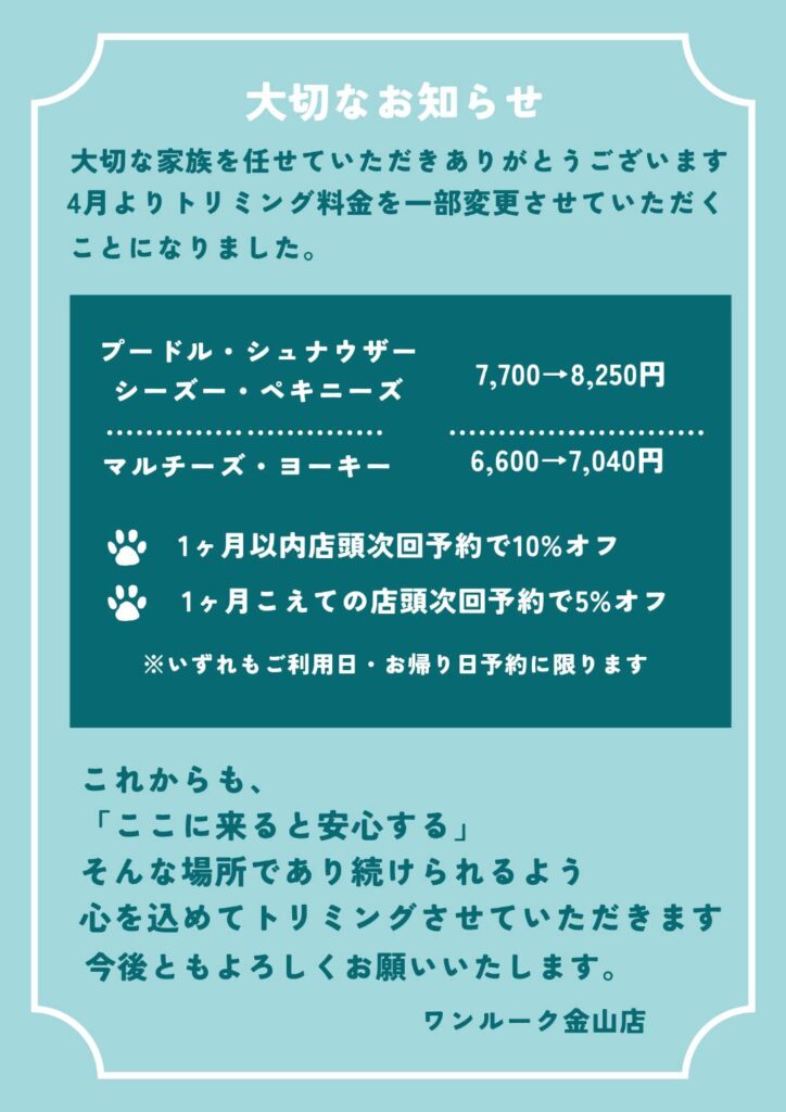トリミング料金変更のお知らせ