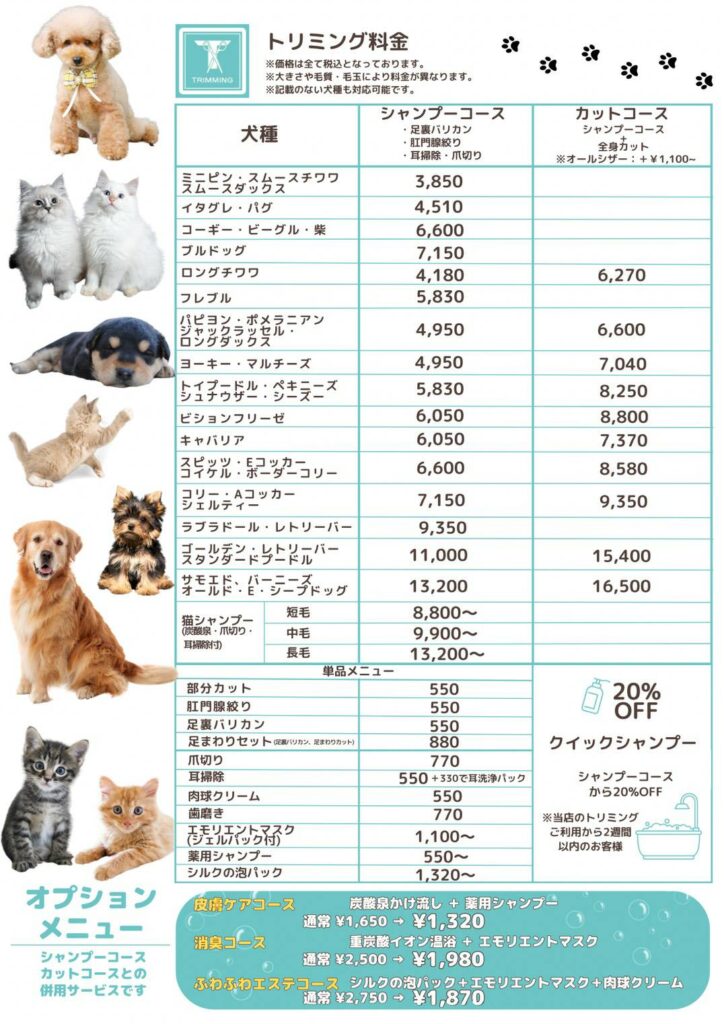 令和8年4月よりプードル、シュナウザー、シーズー、ペキニーズの基本料金が8,250円(税込)。マルチーズ、ヨークシャーテリアの基本料金が7,040円(税込)に変更となります。猫のシャンプーに中毛9,900~が追加いたします。