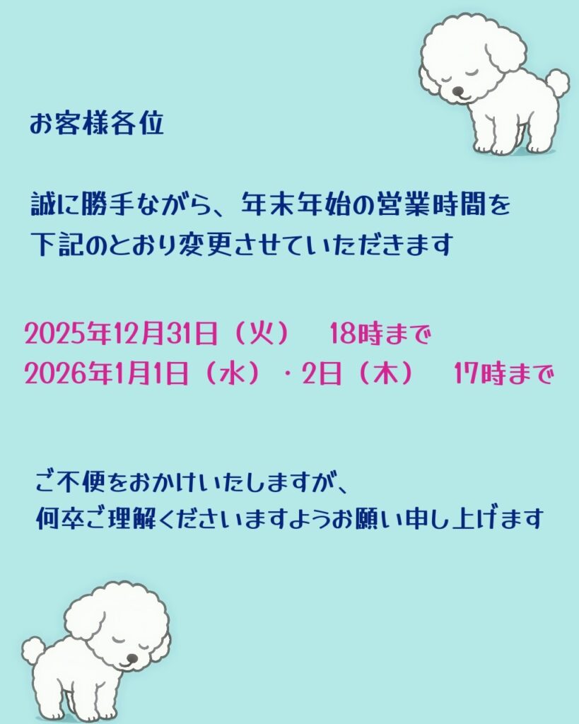 年末年始の営業時間のお知らせ 2025.11.29 未分類 トリミング、ペットホテルのご予約はこちら 予約する お友達登録はこちら ワンルーク大府店 TEL : 0562-38-6669 〒474-0025愛知県大府市中央町6-74-1 < 前の記事へ お知らせ一覧へ戻る