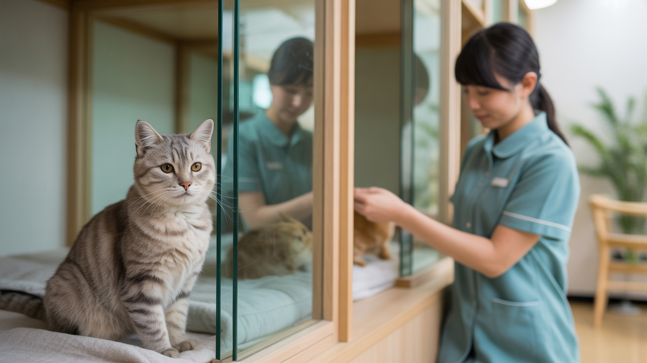 仙台の動物病院併設ホテルでは、大きめの個室ケージ+隔離室を備え、院内感染に配慮した運用をしているケースもあり、持病のある猫には心強い環境です。
